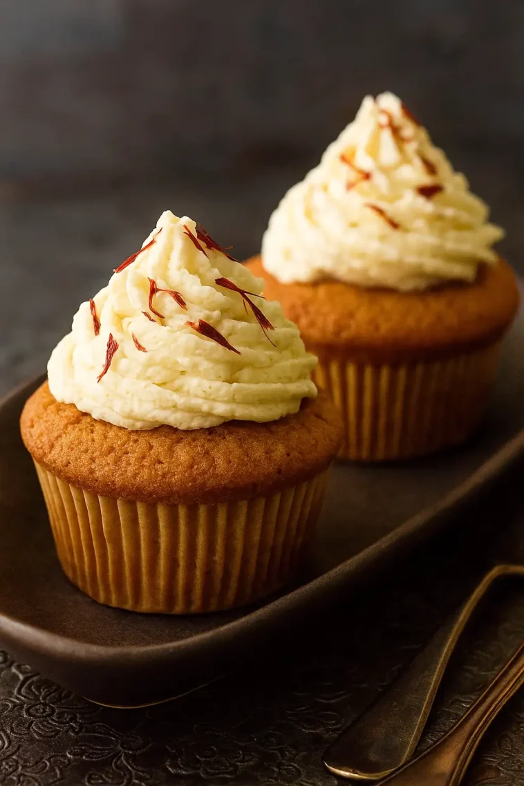 Die kalte Frischkäse-Masse in einen Spritzbeutel füllen und auf die abgekühlten Cupcakes spritzen. Mit etwas Safranfäden dekorieren.