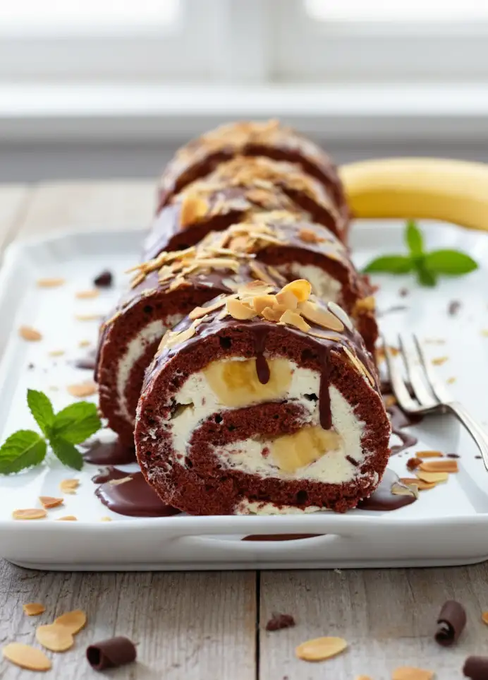 - Anrichten: Schneide die Bananensplit-Rolle in dicke Scheiben und serviere sie auf vorgekühlten Tellern.