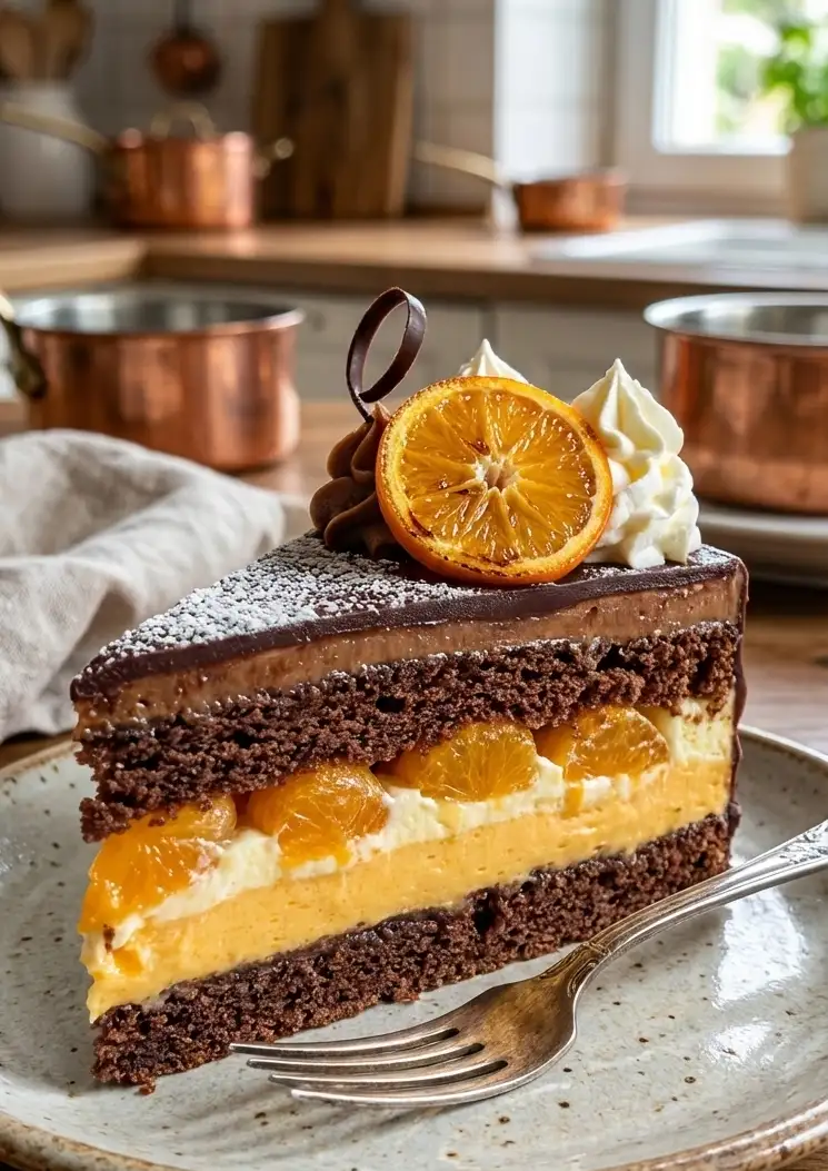 6. Fertigstellung: Schokosahne cremig schlagen, als Kranz auf die Torte spritzen. Spiegel: Orangensaft mit Agar Agar aufkochen, mit Eierlikör verrühren, leicht abkühlen lassen und über die Torte gießen. Mit Orangen oder Schokolade dekorieren.