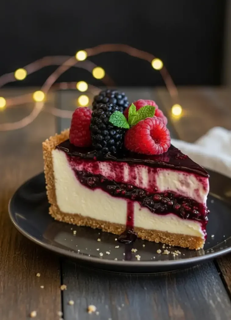 Den Brombeer-Himbeer-Käsekuchen mit Puderzucker bestäuben und nach Belieben mit frischen Minzblättern dekorieren. In Stücke schneiden und genießen!