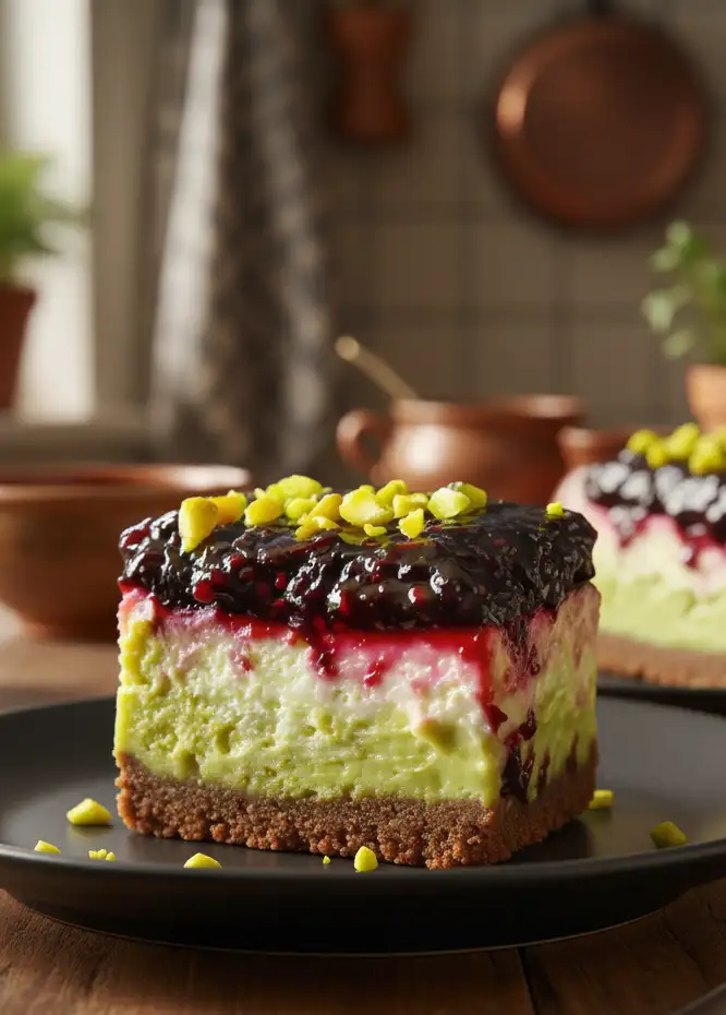- Topping auftragen: Die Brombeermasse vorsichtig über die Käsekuchenfüllung verteilen und mit einem Löffel leicht verwirbeln, um eine marmorierte Optik zu erzielen. Mit gehackten Pistazien bestreuen.