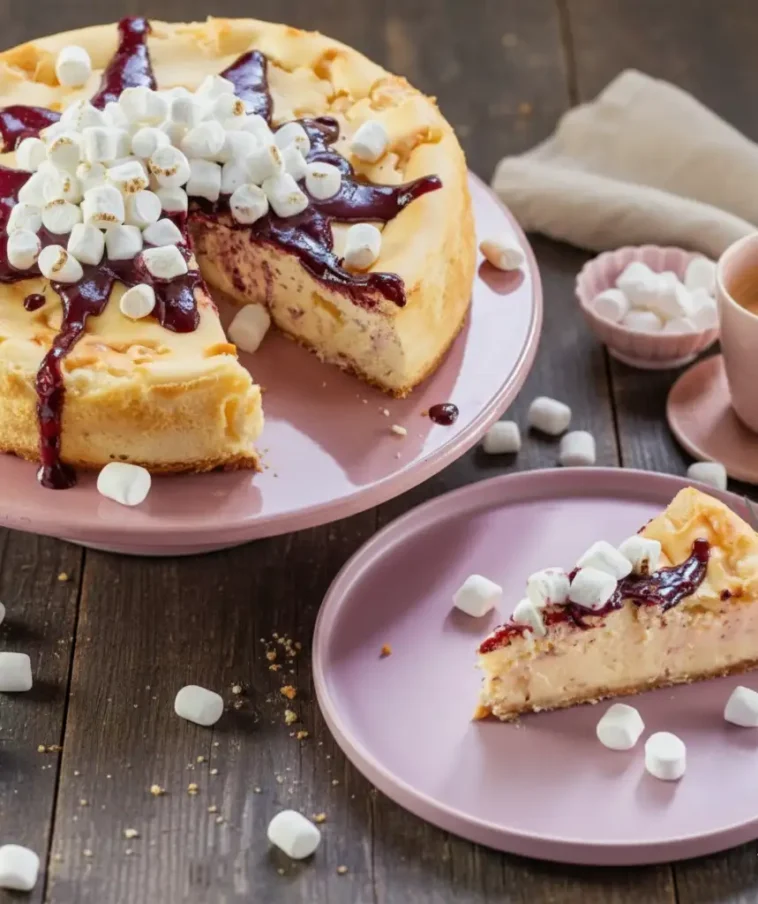 Der Cheesecake mit Blaubeersauce und Marshmallows ist eine himmlische Kombination aus cremigem Käsekuchen, fruchtiger Blaubeersauce und fluffigen Marshmallows, die diesem Dessert eine unwiderstehliche Note verleihen. Dieser Cheesecake überzeugt nicht nur durch seinen Geschmack, sondern auch durch seine ansprechende Optik: Die tiefblaue Sauce bildet einen wunderschönen Kontrast zur hellen Käsekuchenmasse, während die gerösteten Marshmallows für eine süße Kruste sorgen.