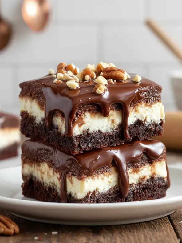 2. Nüsse einrühren: Die gehackten Mandeln oder Haselnüsse unterrühren (falls verwendet) und die Masse gleichmäßig über den abgekühlten Brownie-Boden streichen. Die Fudge-Schicht für 45 Minuten in den Kühlschrank stellen, bis sie fest wird.