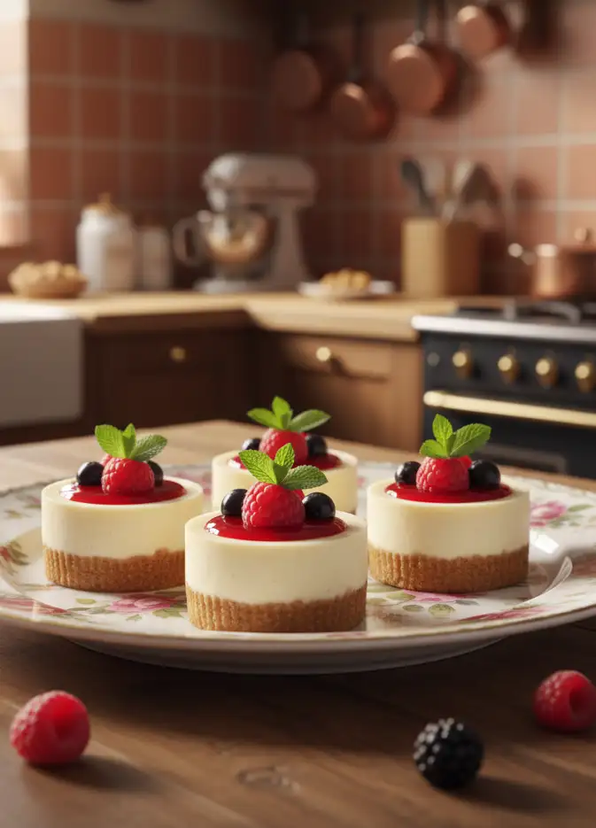 - Servieren: Die Mini-Käsekuchen aus den Förmchen lösen und nach Belieben mit frischen Beeren, Puderzucker oder Schokoladensoße dekorieren.