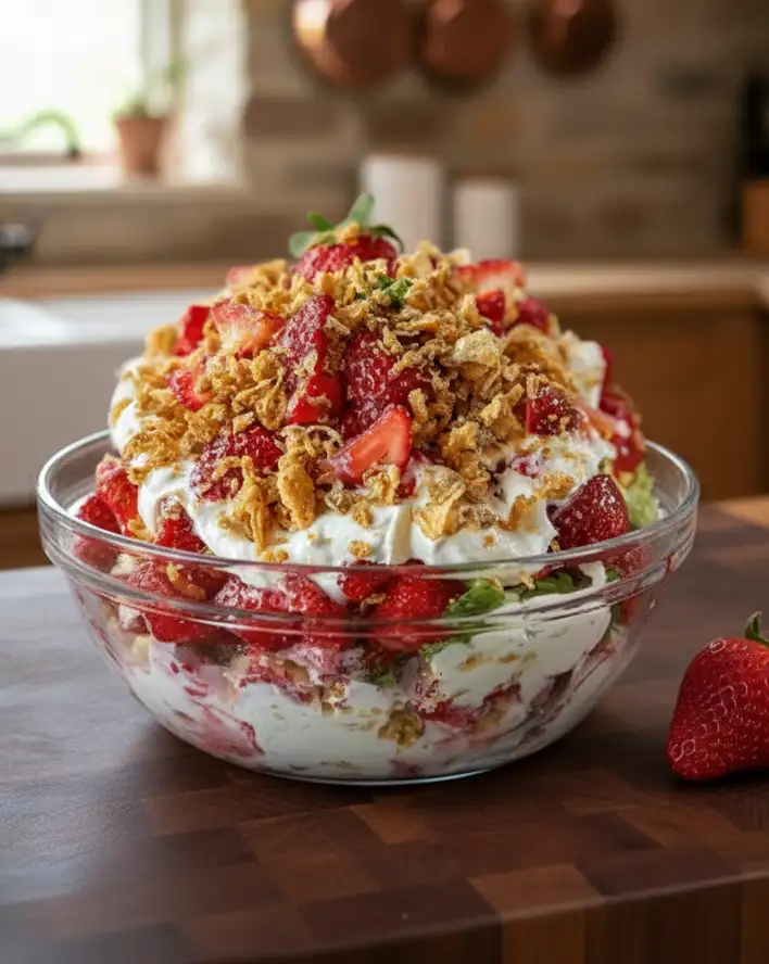 Der Erdbeer-Crunch-Käsekuchen-Salat ist eine erfrischende und kreative Variante eines klassischen Desserts, die perfekt für den Sommer oder besondere Anlässe geeignet ist. Mit saftigen Erdbeeren, einer cremigen Käsekuchenfüllung und einem knusprigen Crunch ist dieser Salat ein wahrer Genuss. Er vereint die Aromen und Texturen eines traditionellen Käsekuchens in einer einfachen und leicht zu servierenden Form. Dieser Salat ist ideal für Partys, Picknicks oder einfach nur als süßes Highlight zu Hause.