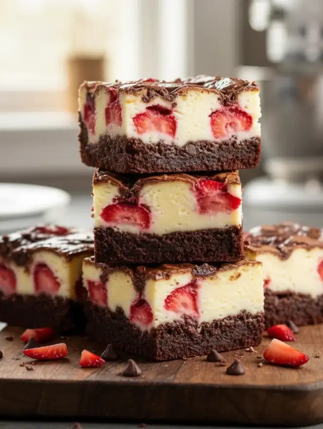Erdbeer-Käsekuchen-Brownies sind die ultimative Süßigkeit für alle, die sich nicht zwischen schokoladigen Brownies und cremigem Käsekuchen entscheiden können. Dieses Dessert vereint das intensive Schoko-Aroma klassischer Brownies mit der fruchtigen Frische von Erdbeer-Käsekuchen – eine Kombination, die jeden Dessert-Liebhaber begeistert.