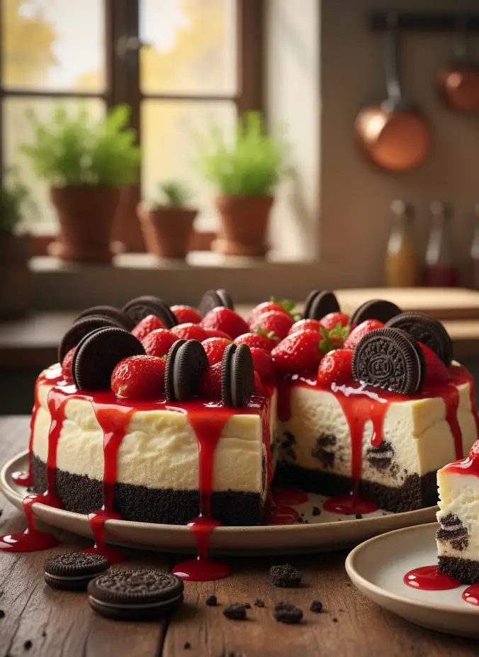 Der Erdbeer-Oreo-Käsekuchen ist ein himmlisches Dessert, das fruchtige Frische und schokoladige Knusprigkeit kombiniert. Mit einer cremigen Käsekuchenfüllung und einer köstlichen Erdbeerkrone ist dieser Käsekuchen ein wahrer Genuss für alle Liebhaber fruchtiger Desserts. Ideal für Geburtstagsfeiern oder einfach als süße Versuchung – dieser Kuchen zieht alle Blicke auf sich und schmeckt einfach unvergleichlich lecker.