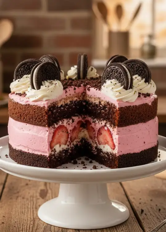 Vor dem Servieren den Kuchen mit ganzen Erdbeeren und zerbröselten Oreo-Keksen dekorieren. Nach Belieben mit frischen Minzblättern garnieren.