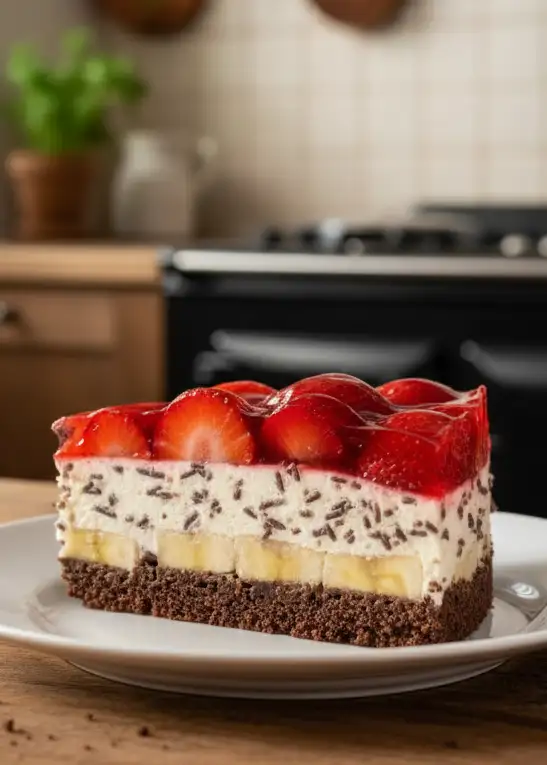 Die Erdbeer-Stracciatella-Bananen-Torte ist ein absoluter Traum für alle Naschkatzen und Torte-Liebhaber! Diese köstliche Kombination aus saftigen Erdbeeren, süßen Bananen und zarter Stracciatella-Creme sorgt für ein perfektes Geschmackserlebnis. Der knusprige Schoko-Keksboden bildet die Basis, darauf folgt eine cremige Schicht aus Schmand, Sahne und Raspelschokolade, die mit frischen Bananenscheiben und Erdbeeren verfeinert wird. Abgerundet wird das Ganze mit einem glänzenden Tortenguss aus Erdbeergeschmack. Diese Torte ist nicht nur optisch ein Hingucker, sondern auch unglaublich lecker und eignet sich ideal für sommerliche Kaffeetafeln, Geburtstage oder einfach als süße Verführung zwischendurch. Besonders in der Erdbeersaison ist sie ein absolutes Highlight und begeistert durch ihre harmonische Balance aus Süße, Frucht und Schokolade.