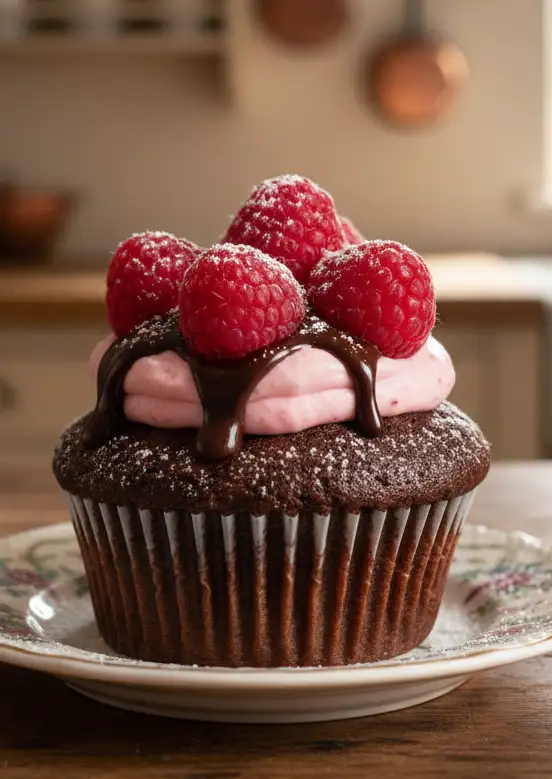 - Die Cupcakes mit frischen Himbeeren und Kakaopulver oder Puderzucker dekorieren.