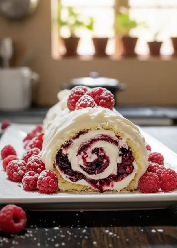 Die Himbeer-Weiße-Schokoladen-Biskuitrolle ist ein exquisiter Genuss, der frisch und fruchtig ist. Die Kombination aus saftigen Himbeeren und zarter, süßer weißer Schokolade macht diese Biskuitrolle zum perfekten Dessert für besondere Anlässe oder als süße Überraschung für Freunde und Familie. Mit ihrer leichten Textur und der ansprechenden Optik wird sie sicherlich zum Star auf jedem Tisch.