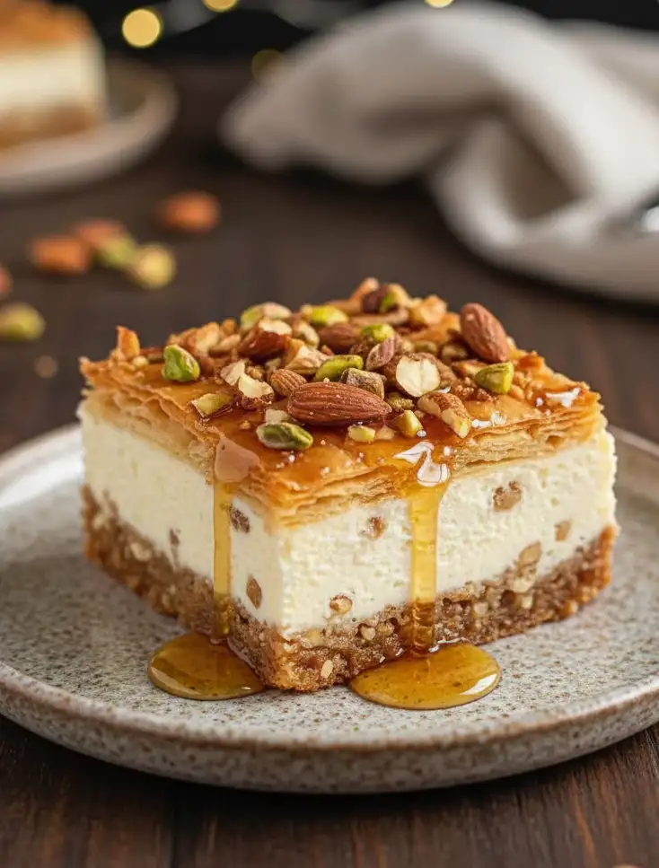 „Entdecke das ultimative Dessert: Honig-Baklava-Käsekuchen – eine köstliche Fusion aus cremigem Käsekuchen und knusprigem Baklava, getränkt in duftendem Honig. Perfekt für Feste, Familienfeiern oder einfach als süße Verführung! Einfaches Rezept mit Schritt-für-Schritt-Anleitung für ein garantiert beeindruckendes Ergebnis. #DessertTräume #BaklavaKäsekuchen #HonigKuchen“