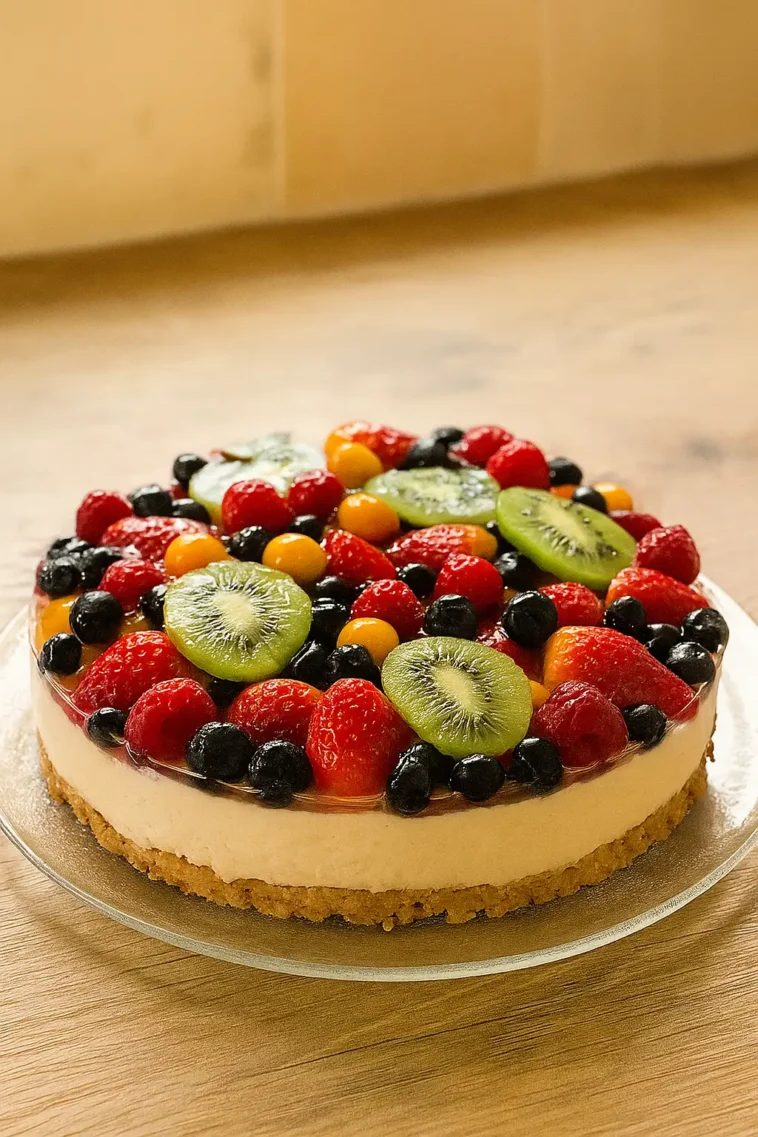 - Glasur & Früchte: Oberfläche mit Tortenguss oder Piping Gel bestreichen, frische Früchte dekorativ anordnen.
