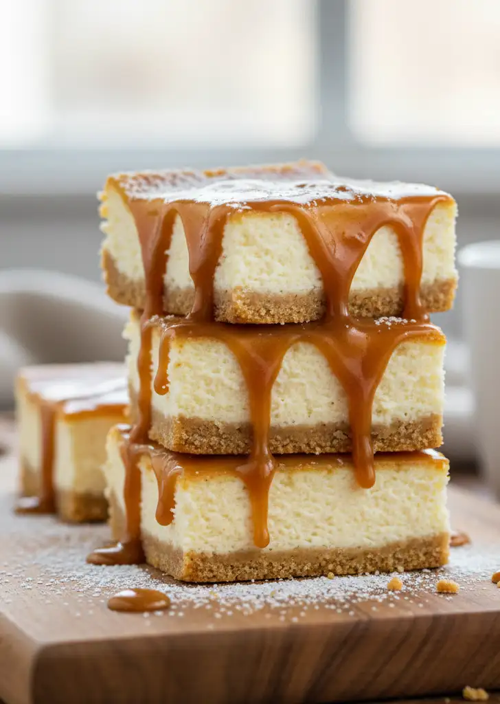 - Erkalten lassen: Lassen Sie das Karamell für 10–15 Minuten fest werden, bevor Sie den Käsekuchen in Riegel schneiden.