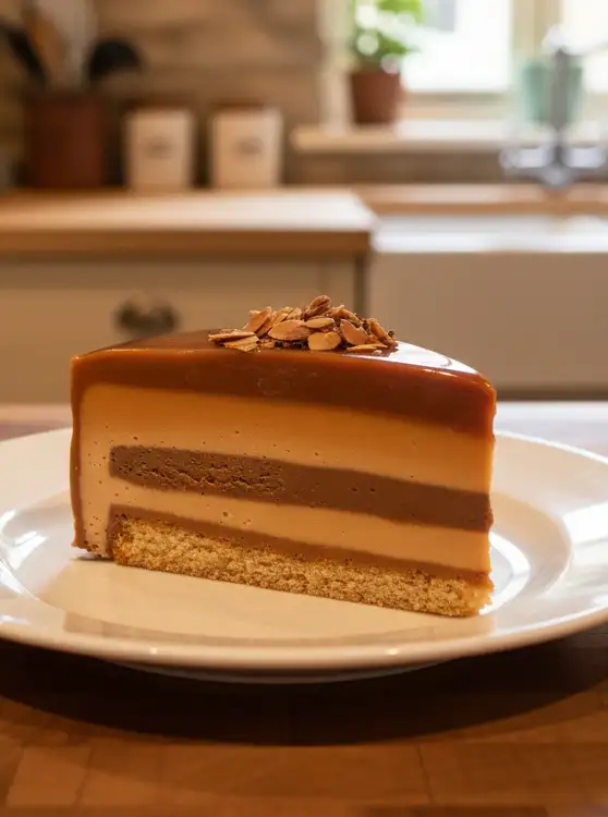 - Torte glasieren: Die Schokoladenschicht gleichmäßig über die Karamellmousse gießen und für weitere 30 Minuten in den Kühlschrank stellen.