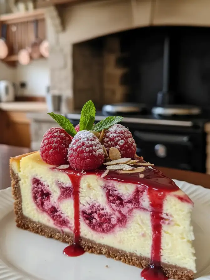 Käsekuchen mit weißer Schokolade und Himbeeren