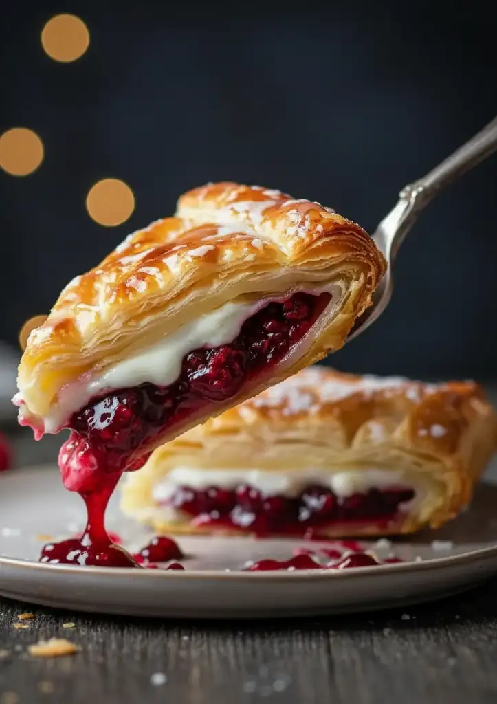 - Füllung auftragen: Jeweils 1 EL der abgekühlten Kirschfüllung in die Mitte jedes Rechtecks geben. Achtung: Nicht zu viel füllen, sonst läuft die Füllung beim Backen aus.