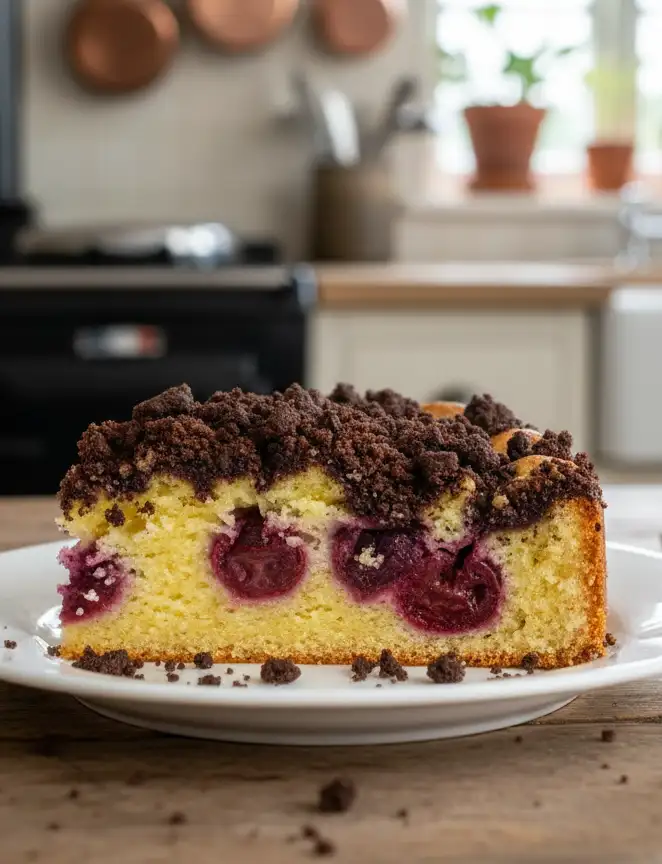 - Backen: Die Schokostreusel gleichmäßig über die Kirschen streuen und den Kuchen im vorgeheizten Ofen für etwa 45-50 Minuten backen. Mit einem Zahnstocher prüfen, ob der Kuchen durchgebacken ist.