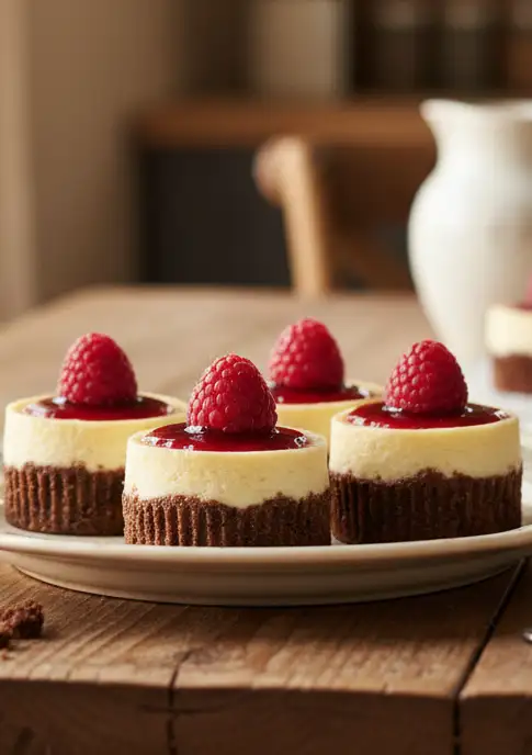 Heizen Sie den Ofen auf 160 °C vor und backen Sie die Mini-Käsekuchen ca. 20-25 Minuten, bis die Füllung gestockt ist. Lassen Sie sie anschließend im Ofen bei geöffneter Tür abkühlen, um Risse zu vermeiden. - Dekorieren und Servieren: