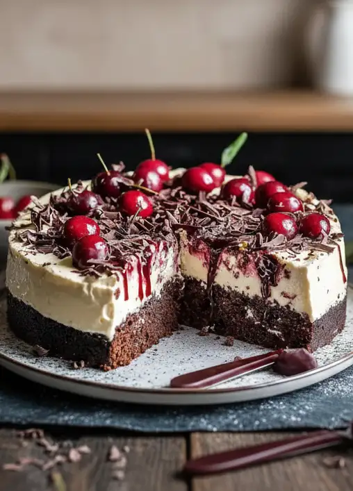 Die restliche Sahne auf die Torte geben und mit Schokoladenspänen sowie Kirschen dekorieren. Die Torte vor dem Servieren für mindestens 2 Stunden kühlen, damit sich die Aromen entfalten können.