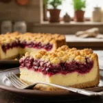 - Backen: Den Cheesecake im vorgeheizten Ofen bei 160 °C ca. 30–35 Minuten backen, bis die Füllung fest, aber noch leicht wackelig in der Mitte ist.