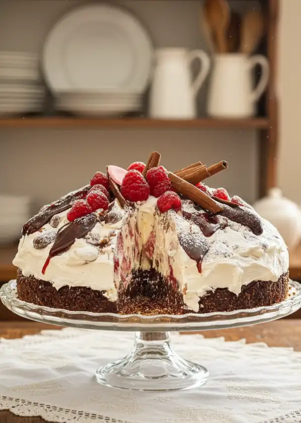 - Die Torte nach Belieben mit Schokoladenraspeln und frischen Kirschen dekorieren. Kühlen Sie die Torte für mindestens 2 Stunden, bevor Sie sie servieren.