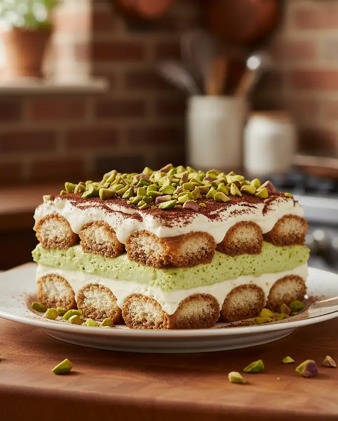 Das nussige Pistazien-Tiramisu ist eine raffinierte Abwandlung des italienischen Klassikers – statt Kaffee und Kakao überzeugt dieses Dessert mit edlen Pistazien, zartem Mascarpone und einer Prise Rosenwasser für einen orientalischen Hauch. Die knusprigen Löffelbiskuits werden mit einer cremigen Pistazien-Mascarpone-Schicht abwechselnd geschichtet und mit gerösteten Pistazien sowie Blütenblättern garniert. Ein traumhaftes Dessert, das jeden Festtagstisch bereichert und Gäste begeistert!