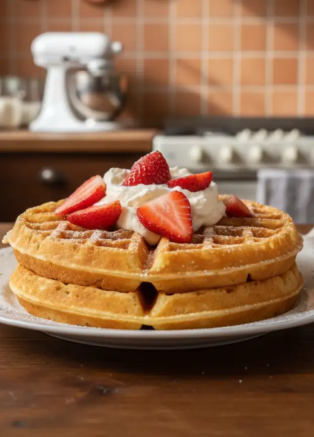 6. Die fertigen Waffeln aus dem Waffeleisen nehmen und mit den gewünschten Toppings servieren.