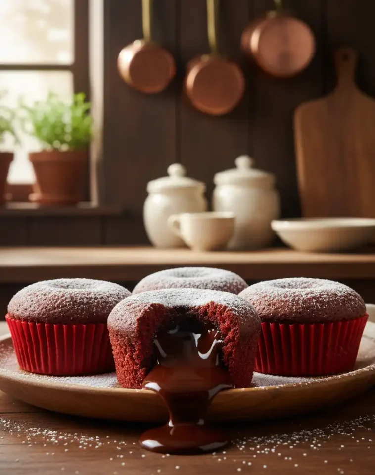 Die Red Velvet Lava Cupcakes sind eine exquisite Kombination aus zartem Red Velvet Kuchen und einer köstlichen Schokoladenfüllung, die beim Reinbeißen in den Cupcake perfekt fließt. Diese delikaten Küchlein sind nicht nur ein visueller Genuss mit ihrer leuchtend roten Farbe, sondern auch ein geschmackliches Erlebnis, das jeden Schokoladenliebhaber begeistert. Ideal für besondere Anlässe oder einfach zum Verwöhnen – diese Cupcakes werden garantiert zum Star jeder Festlichkeit.