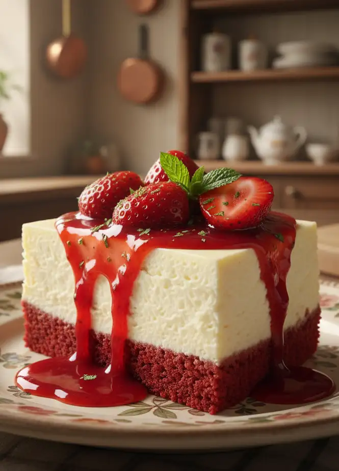 Der Red Velvet Strawberry Cheesecake ist eine verführerische Symbiose aus dem samtigen Geschmack des klassischen Red Velvet Kuchens und der cremigen Eleganz eines Käsekuchens, verfeinert mit einer fruchtigen Erdbeer-Schicht. Dieser Käsekuchen besticht nicht nur durch sein tiefrotes Farbspiel, sondern auch durch die harmonische Balance aus schokoladiger Tiefe, vanilliger Süße und der erfrischenden Säure von Erdbeeren.