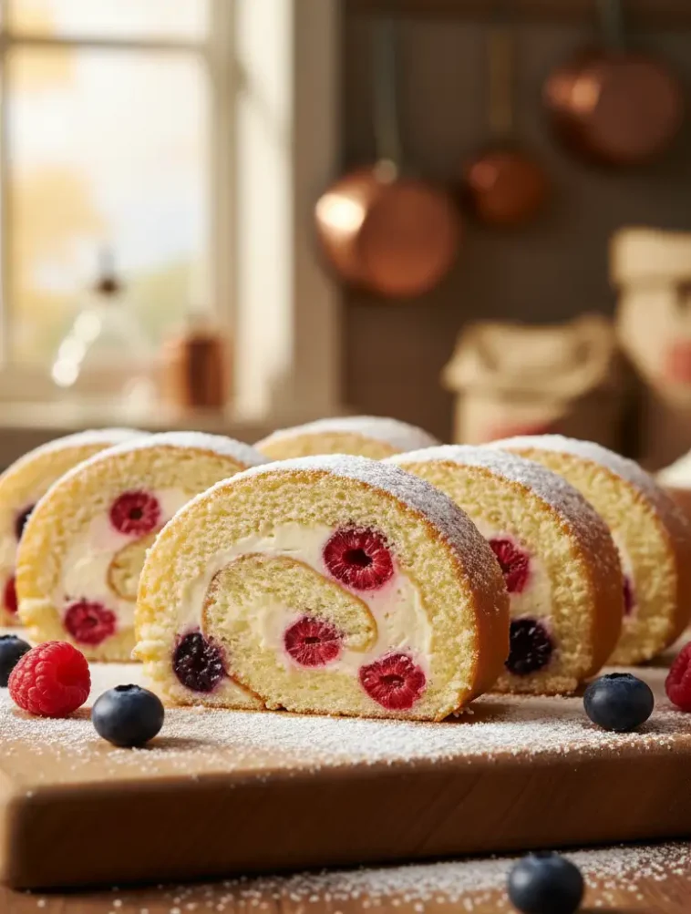- Servieren: Vor dem Servieren die Rolle in Scheiben schneiden, mit Puderzucker bestäuben und mit frischen Minzblättern garnieren.