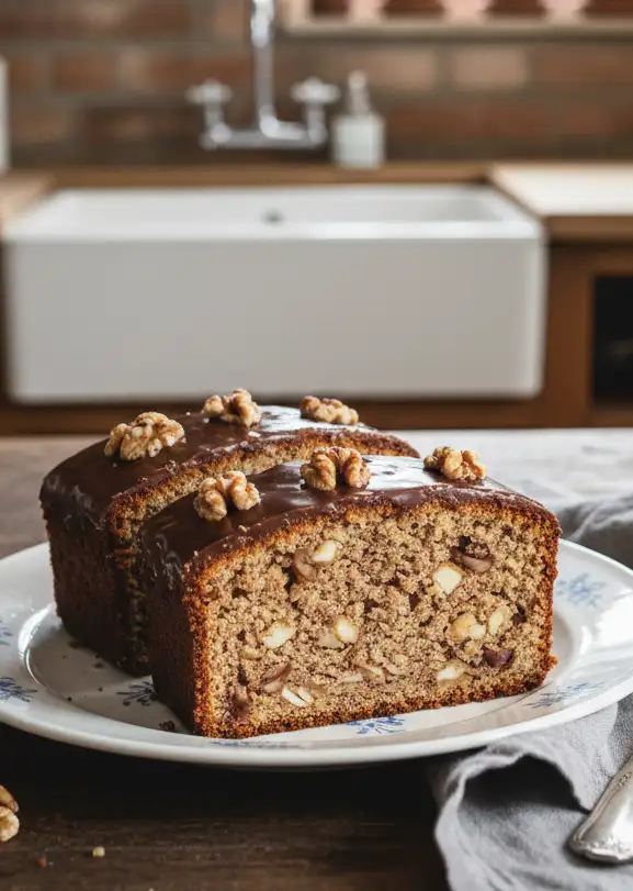 - Kuchen glasieren: Den abgekühlten Nusskuchen auf eine Servierplatte legen und gleichmäßig mit der Schokoladenglasur überziehen. Nach Belieben mit ganzen Nüssen dekorieren.