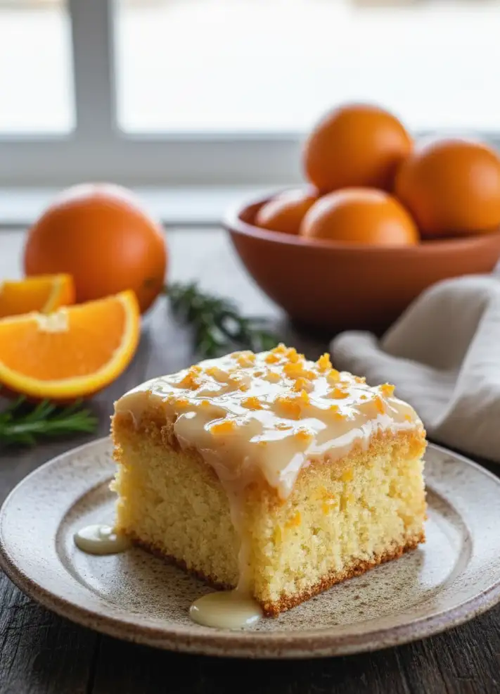 - Tränken und garnieren: Lass den Kuchen 10 Minuten in der Form abkühlen, dann stürze ihn vorsichtig auf ein Gitter. Steche mit einem Zahnstocher mehrere Löcher in die Oberfläche und träufle den restlichen Orangensaft langsam darüber. Für den Guss verrühre 3–4 EL Orangensaft mit Puderzucker zu einem zähen Guss und bestreiche den abgekühlten Kuchen damit. Dekoriere mit Orangenzesten.