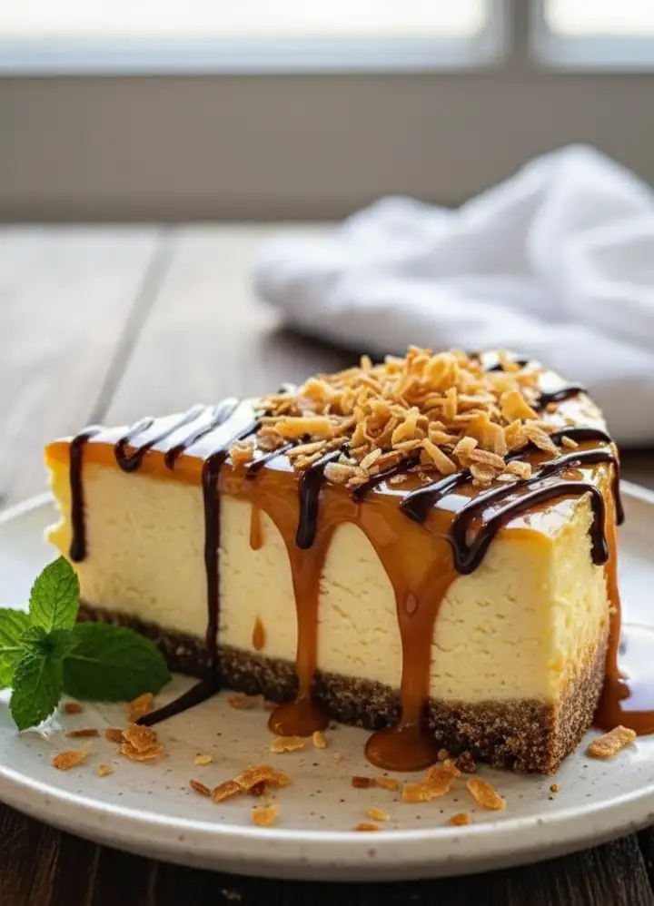 Ein Käsekuchen, der an die Südsee erinnert: Mit knusprigem Keksboden, cremiger Frischkäsefüllung und einem unwiderstehlichen Karamell-Nuss-Topping aus gerösteten Mandeln und Kokosraspeln. Perfekt für besondere Anlässe oder einfach als süße Verführung für zwischendurch!