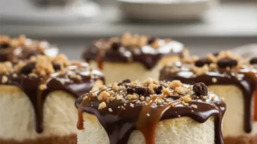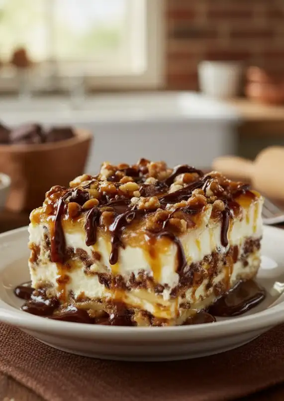 Das Schildkrötenlasagne-Dessert ist eine süße Verführung der Extraklasse – inspiriert von der klassischen “Turtle”-Kombination aus Karamell, Schokolade und Pekannüssen, aber in einer völlig neuen, spektakulären Form. Statt herzhafter Lasagneblätter kommen hier knusprige Keksschichten, cremige Schokoladenmousse, salzig-süßes Karamell und geröstete Nüsse zum Einsatz. Jeder Bissen ist eine Explosion von Aromen und Texturen: weich, knusprig, süß und leicht salzig – einfach unwiderstehlich!