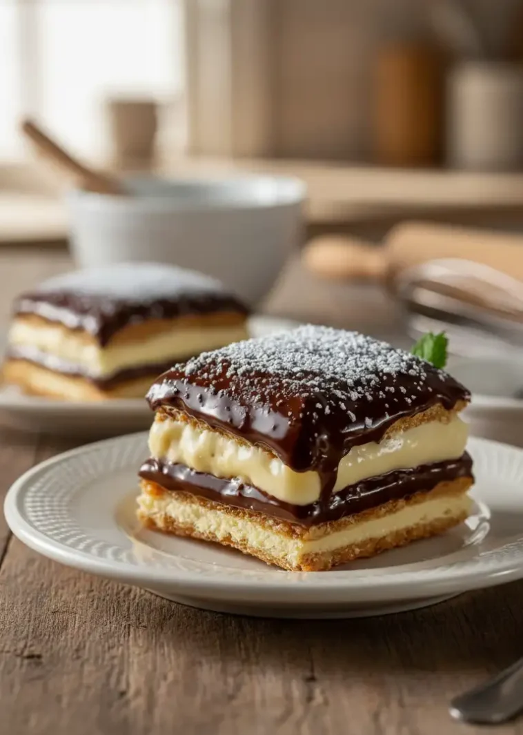 6. Servieren: Die Schoko-Eclair-Kuchenstücke in appetitliche Portionen schneiden und genießen.
