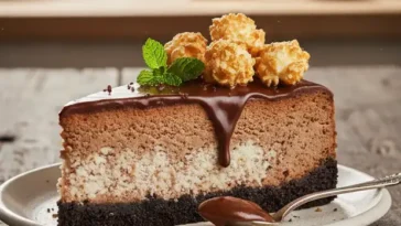 Die Torte sollte mindestens 2 Stunden im Kühlschrank fest werden, bevor sie serviert wird. Sie können die Torte mit frischen Beeren, Puderzucker oder Schokoladenspänen dekorieren, um sie noch ansprechender zu gestalten.