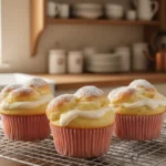 - Dekorieren: Frosting in einen Spritzbeutel füllen und spiralförmig auf die Cupcakes spritzen. Mit Schokoraspeln oder weißer Schokolade garnieren.