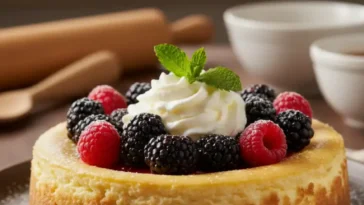 - Backen: Im vorgeheizten Ofen bei 160°C Ober-/Unterhitze (140°C Umluft) für 50–60 Minuten backen. Der Cheesecake sollte außen fest, innen aber noch leicht wackelig sein.