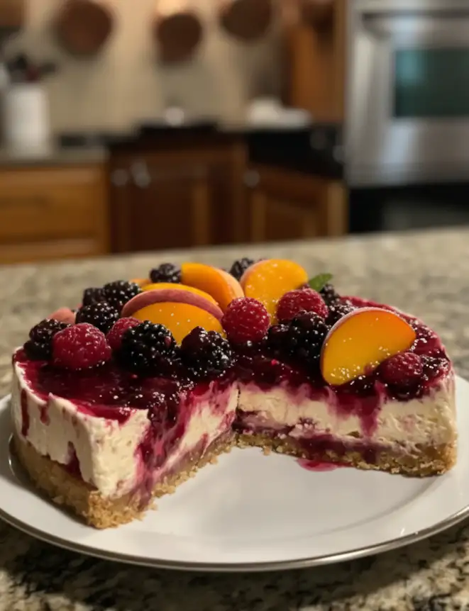 Der Sommerbeeren- und Pfirsich-Käsekuchen ist die perfekte Verkörperung des Sommers auf einem Blech: Eine knusprige Mürbeteigbasis trägt eine luftig-cremige Frischkäsefüllung, die mit saftigen Sommerbeeren und süßen Pfirsichen verfeinert wird. Dieses Dessert vereint die Frische von Himbeeren, Heidelbeeren und Erdbeeren mit der sonnengereiften Süße von Pfirsichen – ein Geschmackserlebnis, das an laue Sommerabende und bunte Obstkörbe erinnert.