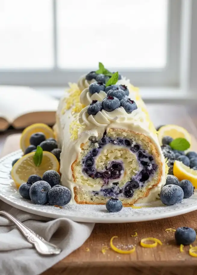 Die Zitronen-Blaubeer-Biskuitrolle ist ein absoluter Hingucker und ein Geschmackserlebnis, das Sommer, Frische und Eleganz in einem Dessert vereint. Diese saftige Biskuitrolle besticht durch die harmonische Kombination aus zitroniger Frische, süßen Blaubeeren und einer luftig-leichten Cremefüllung. Perfekt für warme Tage, Kaffeetafeln oder als krönender Abschluss eines festlichen Menüs!