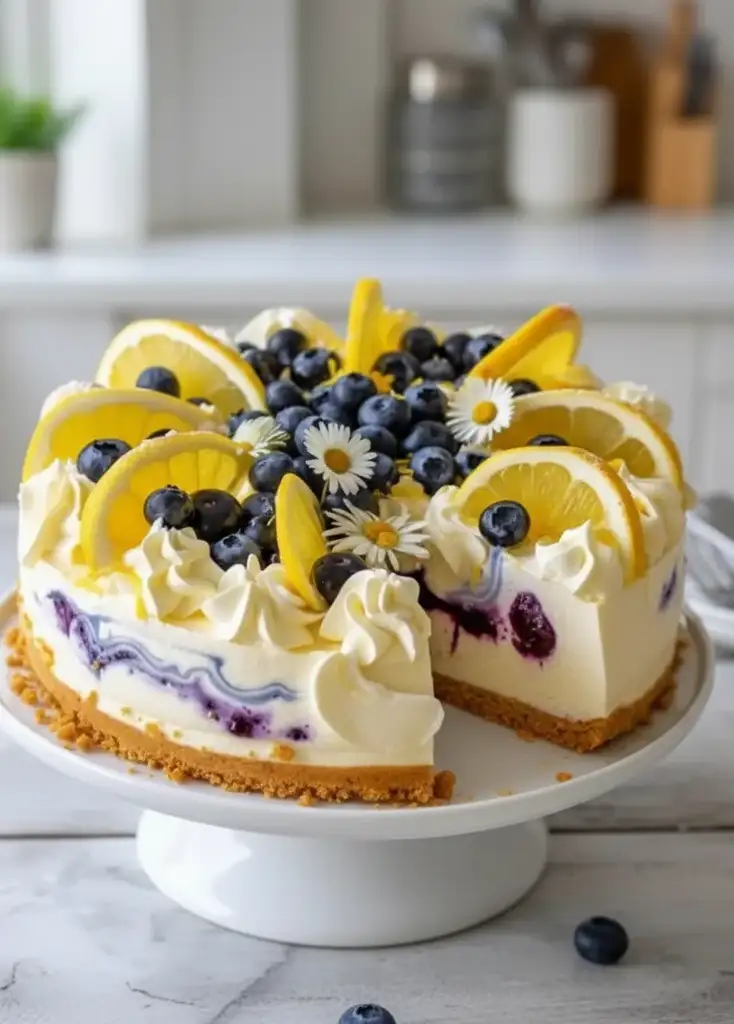 2. Dekorieren: Vor dem Servieren den Käsekuchen mit frischen Blaubeeren, Zitronenscheiben oder -abrieb und etwas Puderzucker garnieren.