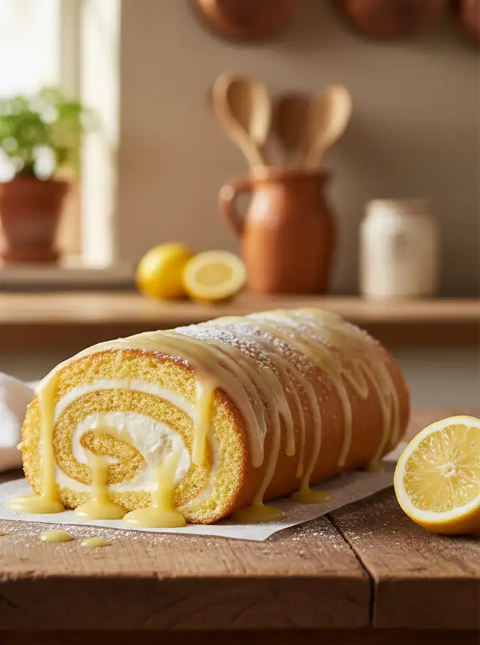 5. Zitronenglasur: Puderzucker mit Zitronensaft glatt rühren und über die Roulade geben, sobald sie fest ist.